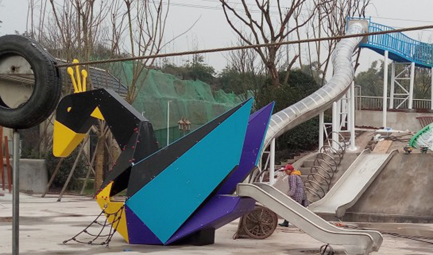 室外景观滑梯,鸟类造型。滑梯、旋转滑梯、攀爬网等各种游乐设备组合。色彩鲜艳,造型深受儿童喜欢。适合公园、儿童乐园等场所。