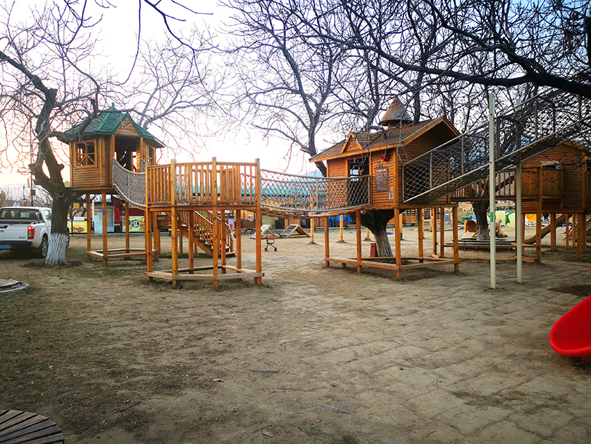 孩子们可以通过扶梯,网绳,攀岩等,各种形式进入木屋,然后再从滑梯下来。真是乐趣无线。