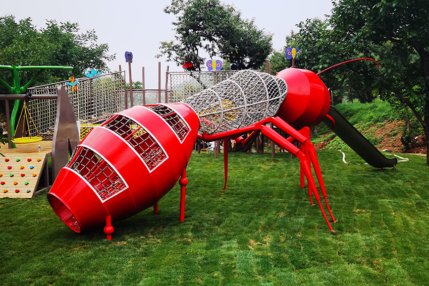 红蚂蚁造型的爬网与滑梯的组合,在场地里特别醒目。